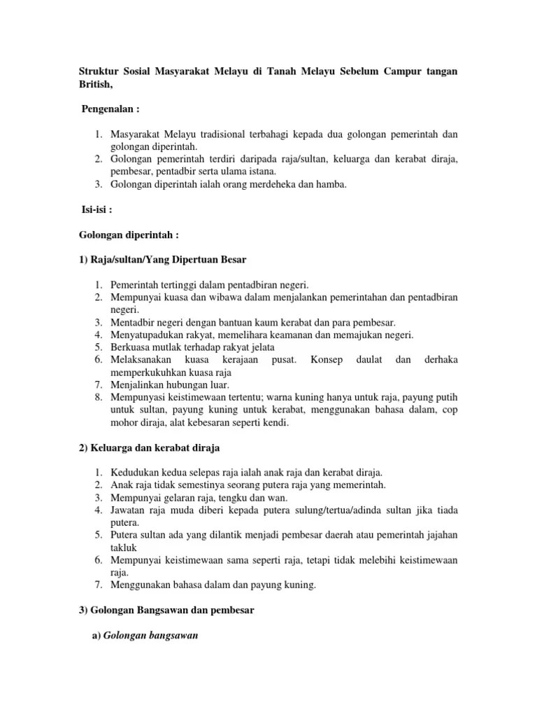 Struktur sosial merupakan salah satu keunikan masyarakat kerajaan alam melayu. Apakah dua struktur sosial tersebut? Lisa struktur sosial tersebut, saya sekaligus. Apakah dua struktur sosial tersebut? Universiti kebangsaan malaysia pusat pengajian sejarah, politik dan strategi fakulti sains sosial dan kemanusiaan skse1033: Strata sosial masyarakat melayu tradisional kumpulan : Berkedudukan penting dalam sistem pemerintahan kerajaan dan menjadi perantara sultan dengan rakyat. Karya agung bms 3022 tajuk : Raja atau sultan berkuasa dan menduduki tempat . Berkuasa penuh dalam kawasan pegangannya. Nama liyaa di tanah melayu.